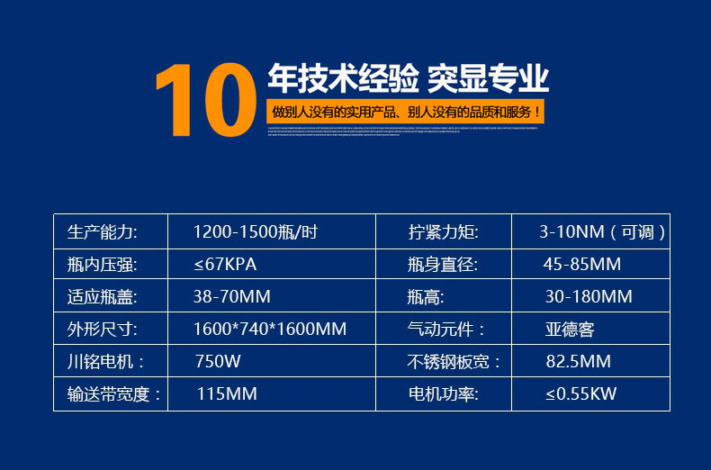 該直線式真空旋蓋機是東泰機械結合用戶使用情況,摒棄了傳統轉盤式真空旋蓋機的弊端,研制開發的新型高效設備,設備自動檢測到兩個瓶子蓋子進入到雙頭真空旋蓋機內,旋蓋機彩色顯示屏會實時顯示旋蓋狀況,整機多點檢測,當進口無瓶無蓋、出口堵塞、定位不準、瓶身傾倒均自動停機。單個旋蓋頭達到的真空度都可以單獨顯示,單獨調整。合格