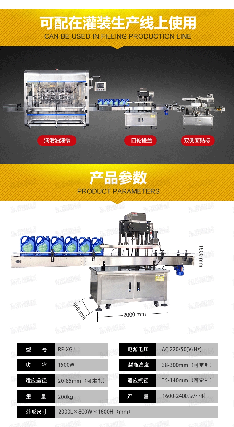 機油自動搓蓋機電氣控制運動,穩定性強;  設有定位裝置,旋蓋標準,操作方便;  鎖蓋范圍寬,可鎖不同形狀規格的瓶蓋;解決了噴頭、泵頭、噴霧泵、手扣式噴頭旋蓋難的