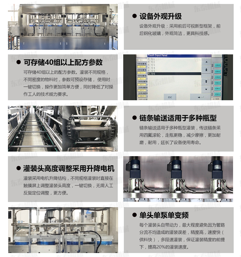 3、摒棄了傳統(tǒng)夾瓶口灌裝方式,采用下潛式灌裝專利下料口設(shè)計(jì),邊灌邊提,避免了灌裝速度快產(chǎn)生細(xì)小水珠噴濺污染瓶口的現(xiàn)象產(chǎn)生。配合多段式快慢速灌裝,可以保障高速灌裝時(shí)全速灌裝,又可有效解決氣壓過高快速灌裝時(shí)泡沫溢瓶現(xiàn)象,變頻控制更精確,自我保護(hù)更安全,穩(wěn)定,延長設(shè)備使用壽命。