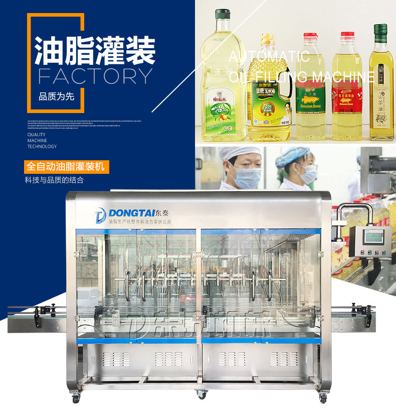 4.全自動食用油灌裝機采用動力灌裝,無需配裝高位罐,簡化了安裝工序,降低了生產成本,提高了灌裝效率;